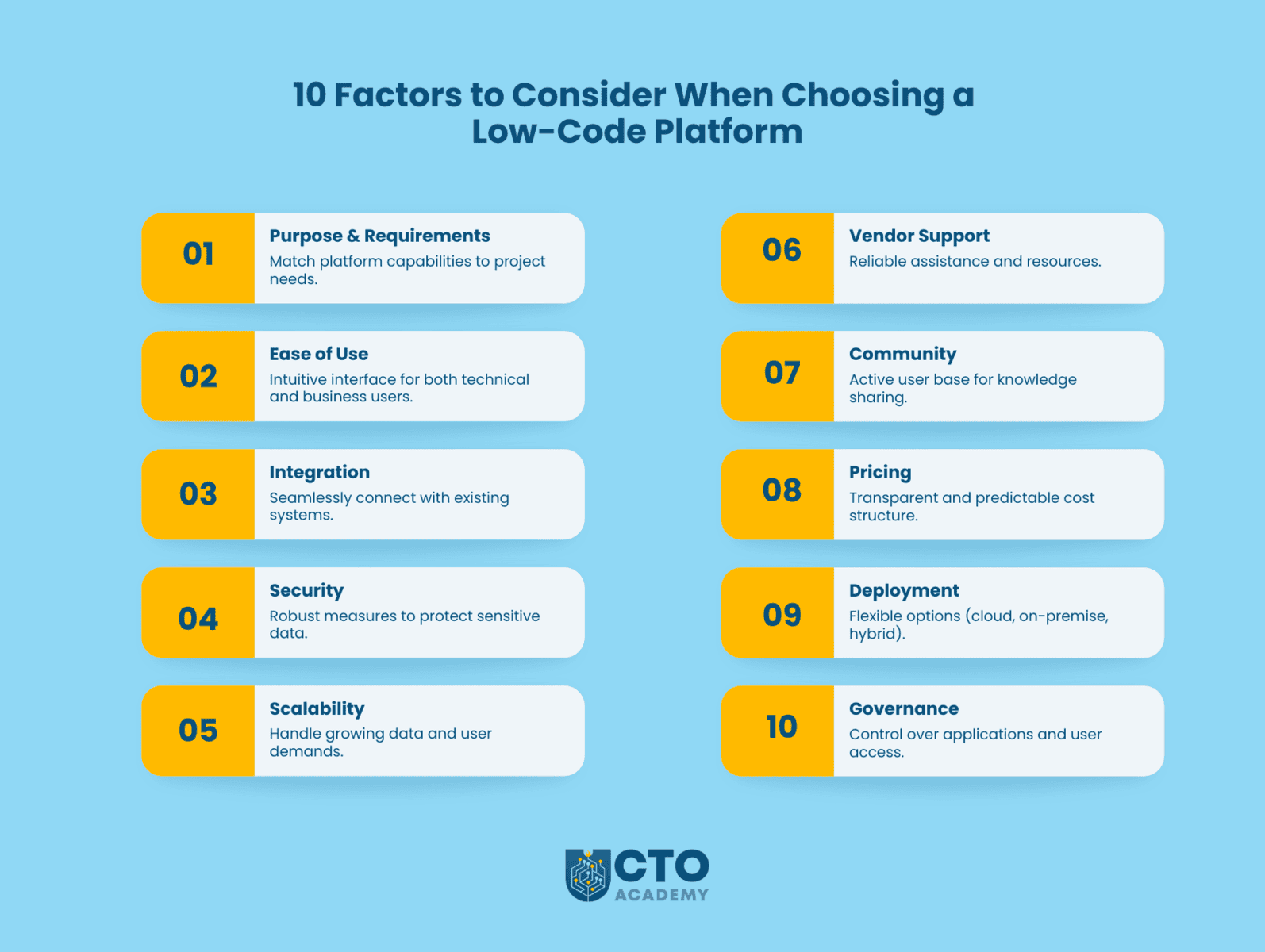 10 Factors to Consider When Choosing  a Low-Code/No-Code Platform - infographic summary