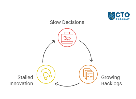 Decision latencyArchitectural choices linger in “review” for weeks; cross‑team trade‑offs bounce between meetings without closure.The new exec lacks the contextual breadth—or confidence—to weigh risk quickly, so they defer or seek consensus on every choice.