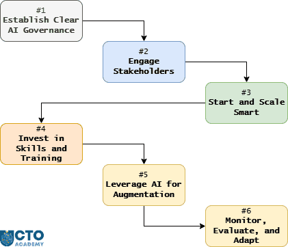 - Engage Stakeholders by forming AI committees (for mid-sized to large organizations) and maintaining transparent communication.