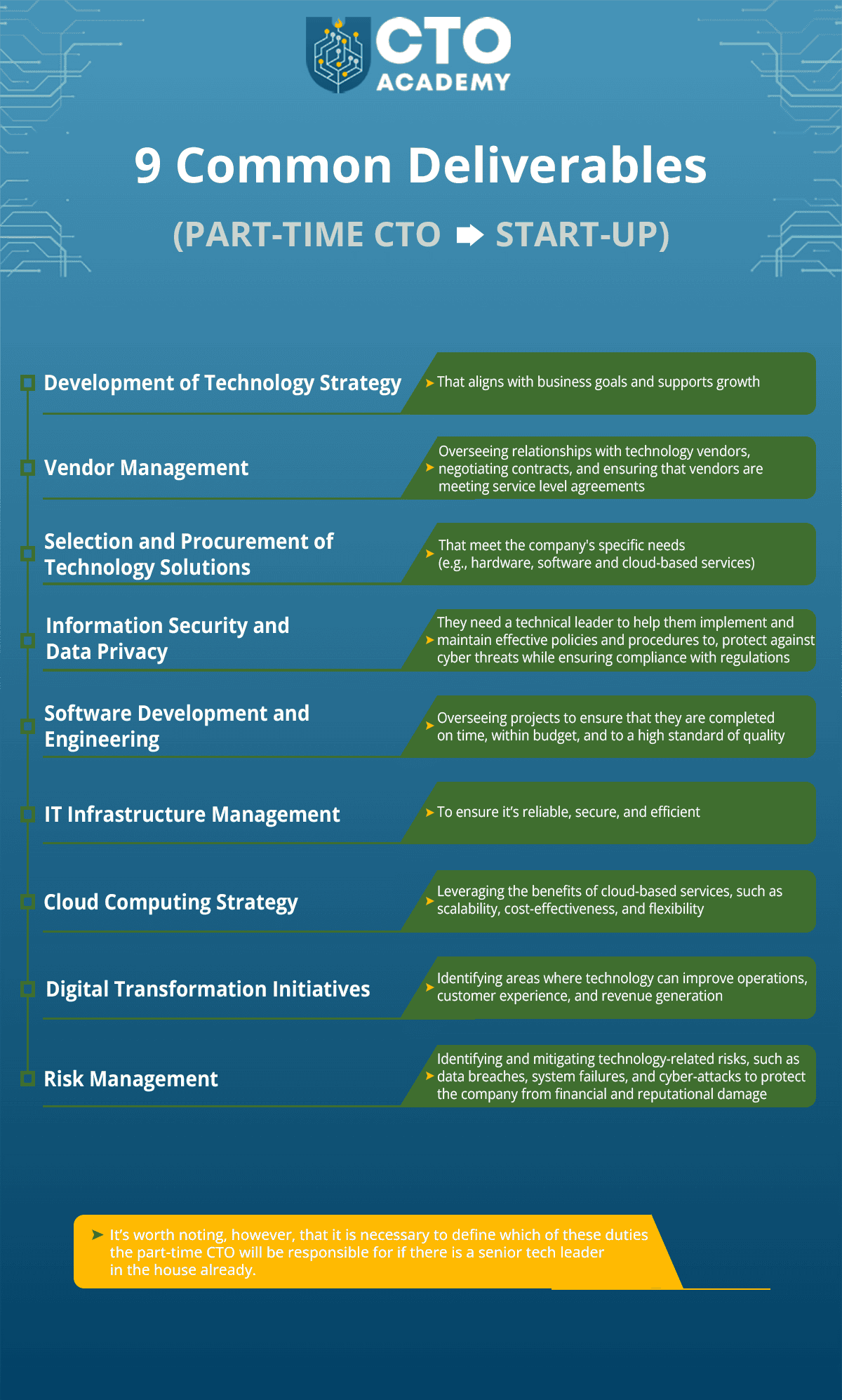It’s worth noting, however, that it is necessary to define which of these duties the part-time CTO will be responsible for if there is a senior tech leader in the house already. For instance, an experienced part-time CTO could take over commercial topics while coaching the in-house CTO who takes care of everything else related to the role.
